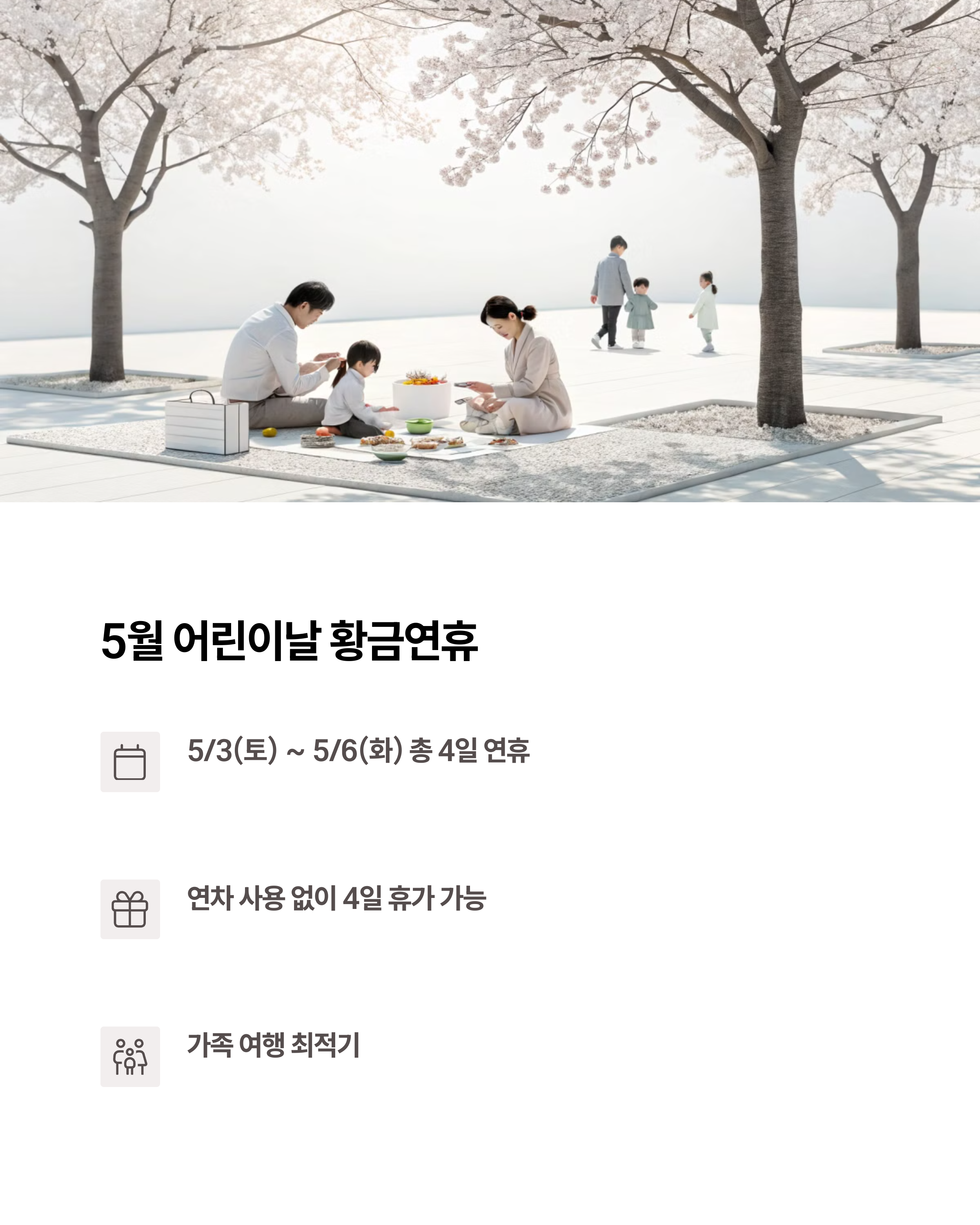 ✅ 5월 어린이날 + 대체공휴일 (4일 연휴)